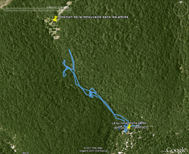 Les restes de ballon, le parachute et la nacelle au sommet d’un sapin.