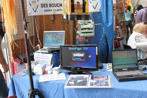 A gauche du stand, présentation de l’APRS, au centre visionnage de nos DVD Boufigo, à droite, démonstration de modes numériques. Au fond, la dernière nacelle Boufigo 11 …