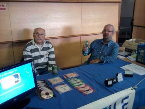 Au stand de l’ADREF 13, J.baptiste F2VH et Michel F5YH à la vente des DVD Boufigo.