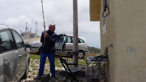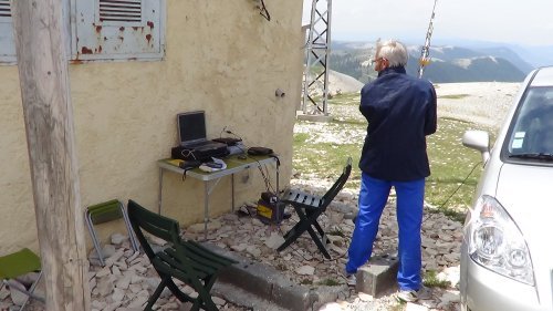 Pendant ce temps, au sommet de la montagne de Lure (04) à 1800m d’altitude ou soufflait un vent TRES violent, deux équipes composées de F6EUZ (ici en photos) F4ESK et F6GAU, étaient en place pour récupérer les dernières trames APRS.