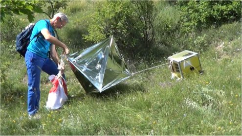 A 13h35, le ballon a éclaté à une altitude de 31381 mètres. Il a alors entamé une descente vertigineuse ce qui nous arrangeait car sinon, c’était loin dans les Alpes qu’il aurait fallu aller le chercher ! A 14h03 perte de la nacelle au nord – est depuis la position de Lure, l’altitude est de 1530 mètres. Machinalement, Robert F6EUZ et Patrice F4ESK se raprochent du bord du sommet de Lure coté nord et retrouvent un signal qui n’est pas assez costaud pour être décodé en vertical. Mais en horizontal, c’est le jackpot ! le signal est à fond et là le THD7 donne une position qui est aussitôt rentrée dans les GPS. (N 44.16.67 – E05.49.93) Le temps de tout remballer et nos lascars arrivent sur zone en moins d’une heure.
