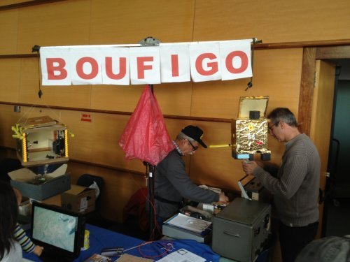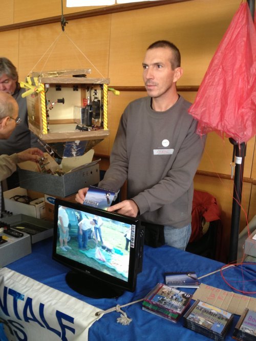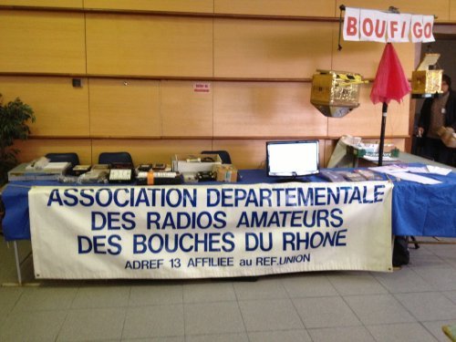 Notre traditionnel stand avec une partie brocante à gauche, une partie Ballon Boufigo au centre et la partie QSL du 13 à droite.