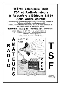 Samedi 02 mars 2013 à Roquefort la Bédoule salle André Malraux se tiendra le 16 ème salon de la radio et de la TSF. Heure d’ouverture de 9h à 16h , entrée libre.