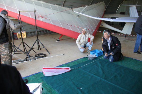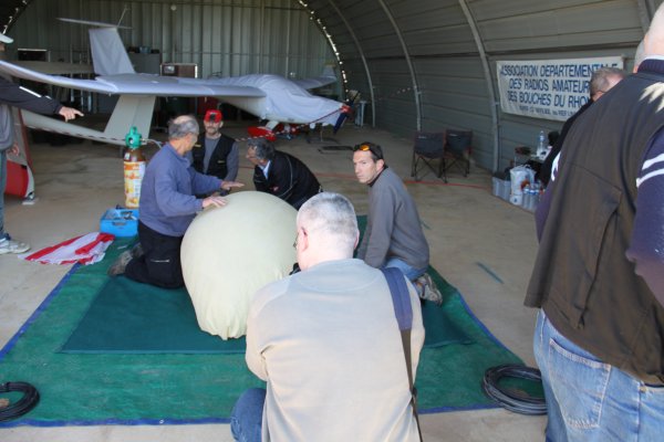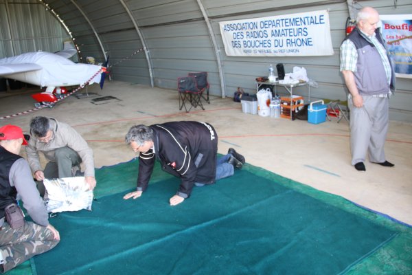 Grâce à Marc F1OVL ( que nous ne remercierons jamais assez pour sa gentillesse), nous avons pu installer l’aire de gonflage du ballon à l’intérieur de son hangar .