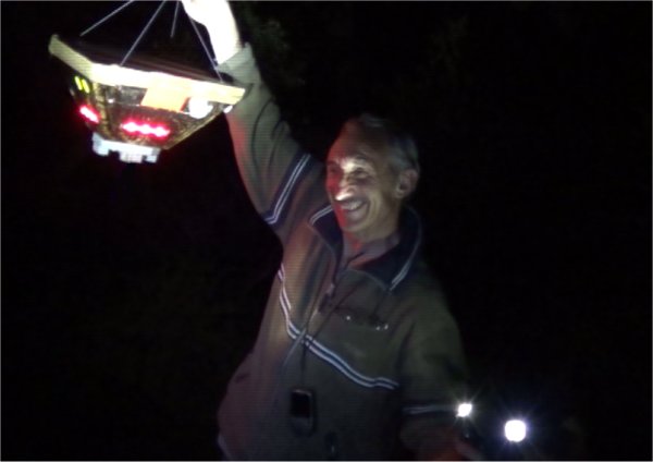 Robert avec la nacelle B15 fièrement portée avec pour l’occasion de la photo, la ceinture de LED luminescente remis en fonction. A noter que, malgré une chute libre de 16 kms, rien n’a bougé à l’intérieur … même pas une pile de déplacée. En fait sa chute a été amortie par les nombreuses branches de l’arbre qui l’a gentillement accueilli ! Une sacrée chance …