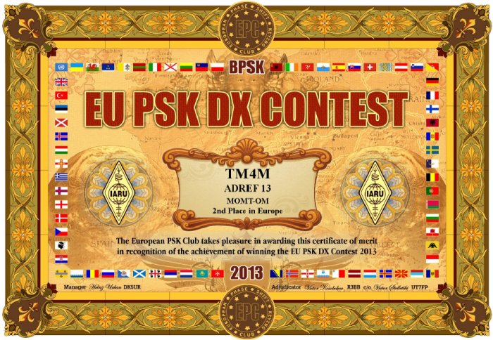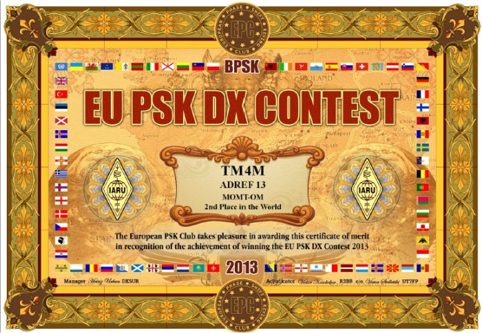 Résultat de TM4M au EU PSK DX CONTEST 2013 Voici les différents classements de TM4M ainsi que les diplômes : – 2eme place dans le monde, – 2eme place en Europe, – 1ere place en France. Merci aux opérateurs qui ont permis ce succès … Partager : Cliquer pour partager sur X(ouvre dans une nouvelle fenêtre) X Cliquez pour partager sur Facebook(ouvre dans une nouvelle fenêtre) Facebook J’aime chargement… Similaire