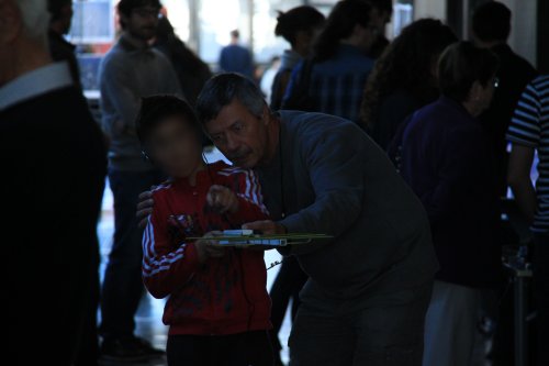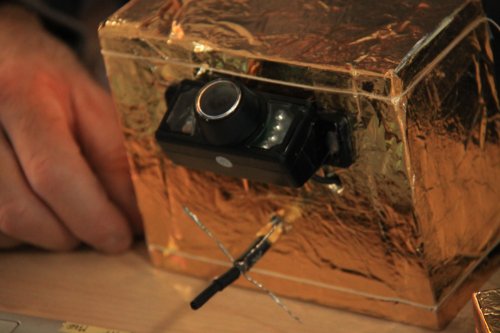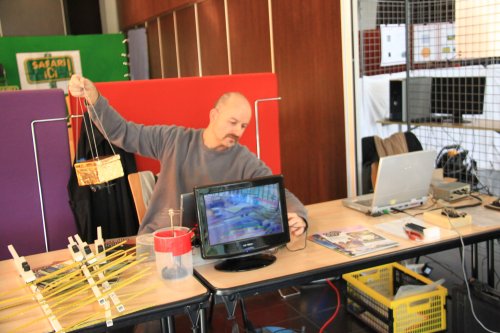 Cette année, il était prévu de mettre sous un ballon solaire une mini nacelle dans laquelle était placée une caméra vidéo avec son émetteur 2,4 GHz. Ici en test au stand de l’ADREF 13 avec la retransmission en live pour le public.