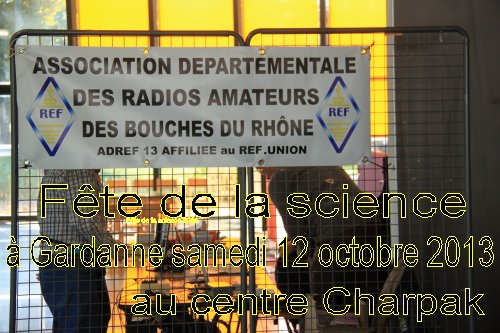 C’était ce samedi 12 octobre 2013 que l’ADREF 13 a participé à la fête de la science sur le site Charpak de Gardanne. Les festivités se sont déroulés de 10h à 17h et comme d’habitude une équipe de l’ADREF 13 composée de F1MMT – F4DDX – F5LTH – F4ESK – F6DHI – F6GMO et SWL Yves se sont activés dès 9h à installer tout le matériel.