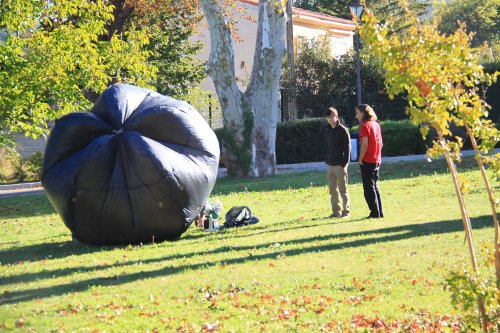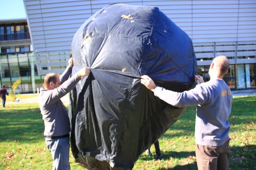 Dehors, il s’agit d’essayer de faire voler un ballon solaire de 4m de diamètre à base de sacs poubelle. Malheureusement, le ballon constitué est trop lourd pour s’élever dans le ciel …