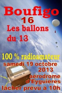 Ce sera bien pour ce samedi 19 octobre 2013 que la Boufigo 16 sera lâchée depuis l’aérodrome d’Eyguières entre 9h et 10h … Comme vous le savez, vous aurez la possibilité de recevoir des images SSTV en scottie 2 de notre belle planète depuis le 144,650 Mhz … Que celà ne vous empêche pas de venir nous voir …