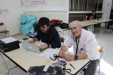 Ambroise (F4CNZ) et Mathieu (F6GCQ) . Impression et distribution des badges