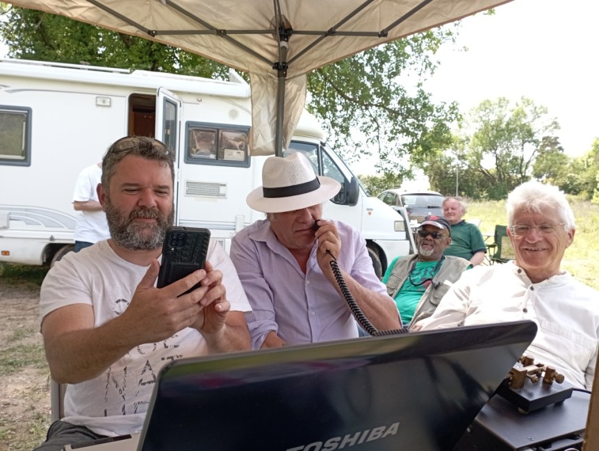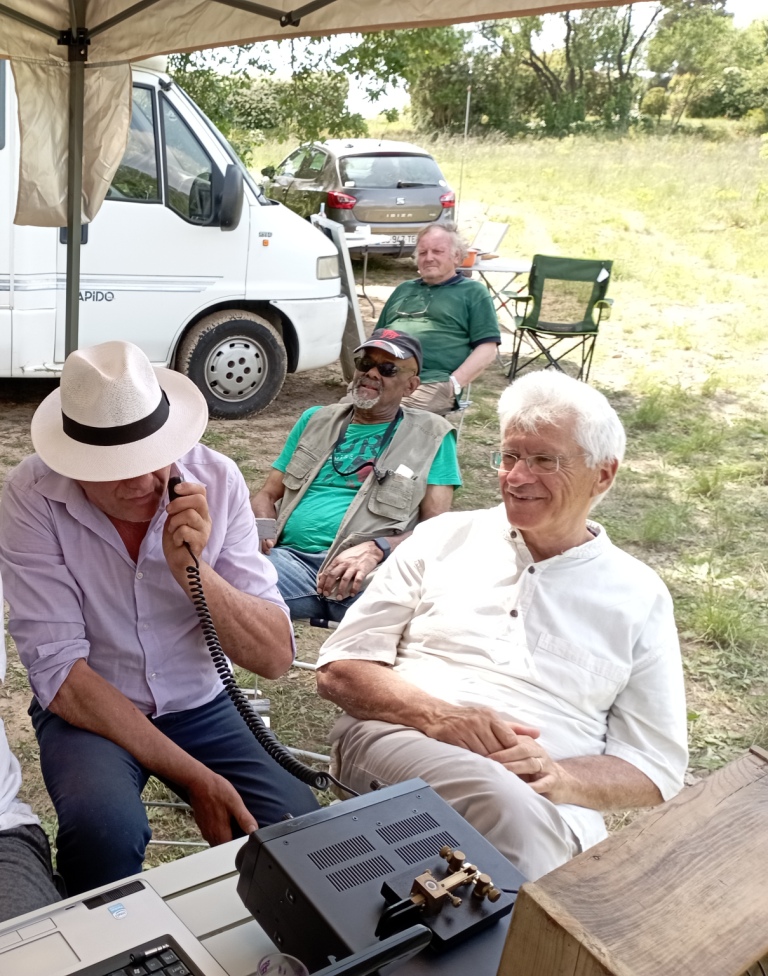 Avant de passer en émission, contrôle avec le VNA par Pierrick F1CEP de l’accord de l’antenne, bonne initiative car ce n’est pas bon. Il faut raccourcir. Pour finir on est calé pour le 40m en utilisant tout de même le tuner automatique. C’est une journée très ensoleillée et nous nous installons sous l’auvent du camping-car de David F5SDD, il y fait moins chaud et l’écran du PC est visible. Nous sommes enfin installés et pouvons commencer. Ce sont les italiens qui ouvrent le bal.