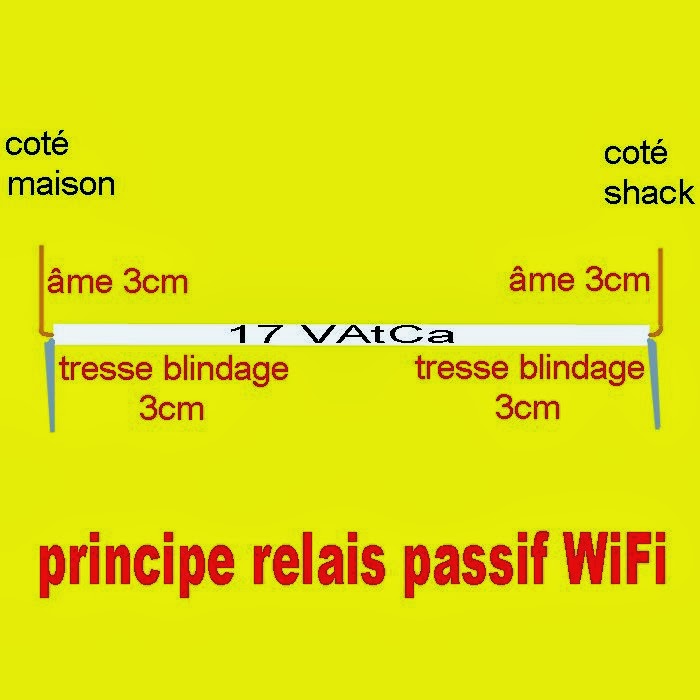Pour que çà marche, il faut mettre une des deux antennes le plus prêt possible de la source (la Box internet dans mon cas) et mettre un minimum de longueur de câble coaxial qui vient alimenter la deuxième antenne. Ce n’est pas le cas pour moi puisqu’il me faut une bonne quinzaine de mètres de câble. D’où l’importance de la qualité du câble à employer. J’ai donc utilisé du câble coaxiale pour réception satellite, du 17 VAtCa que l’on trouve dans n’importe quelle surface de bricolage. Son diamètre est de 6,8 mm, son impédance de 75 ohms et son coef de vélocité de 0,85.