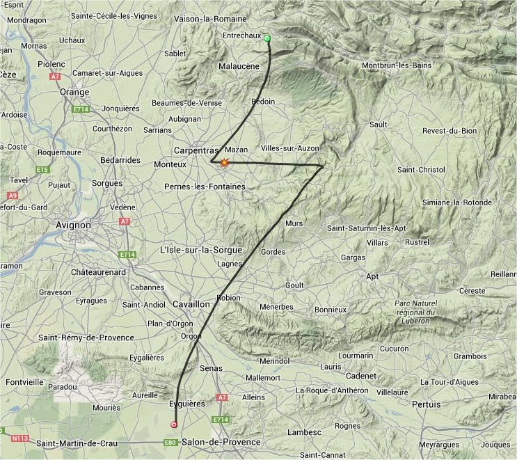 C’était donc ce samedi 8 juin 2013 que Boufigo 15 a été lancé avec succès depuis l’aérodrome d’Eyguières. Les prévisions de vol nous donnait comme indication le nord, nord est avec un atterrissage du coté de Vaison la Romaine dans le 84. En quinze lâchers, c’est la première fois qu’une de nos Boufigo doit aller si loin au nord … Encore une première pour nous donc ! Une ombre au tableau cependant nous faisait douter : la météo au sol dans toute la région, y compris sur une grande partie de la France d’ailleurs, prévoyait des orages avec de fortes précipitations locales. Heureusement, il n’en fut rien !
